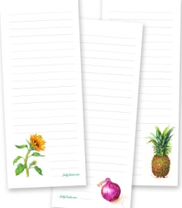 California botanical artist, Sally Jacobs, has created new notepads for 2010. They feature her watercolor paintings of a red onion, a pineapple, and a sunflower. These notepads make a great birthday gift, hostess gift, or a “just because” gift for Mom. See the Sally Jacobs Collection to view this new line of stationery ($7 each).