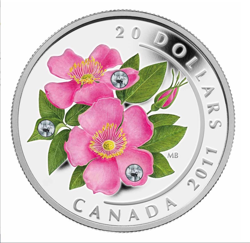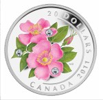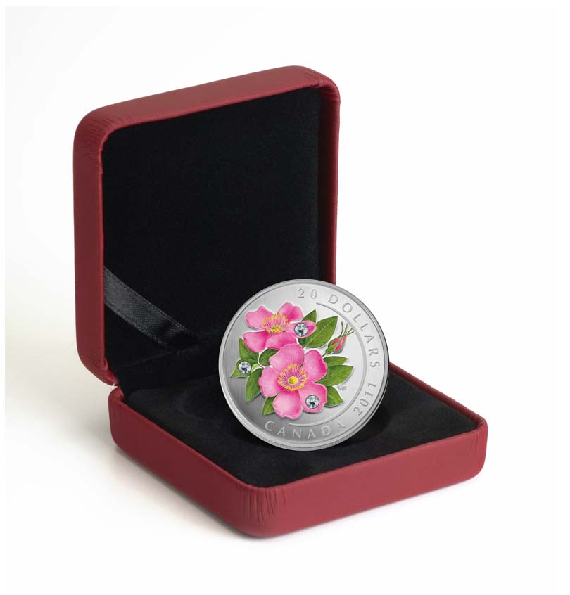The Royal Canadian Mint is well known for issuing commemorative and collectors’ coins of unique and colorful designs to which it adds elements such as, in the case of this coin, genuine Swarovski crystals. The background of a proof finish on pure silver sets off the color of Best’s rendition of a wild rose to dramatic effect.