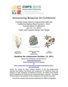 The California Native Plant Society will host an exhibition of botanical art at its January conference. All artists are invited to submit two-dimensional artwork in any medium for consideration. Artwork must be botanically accurate and must feature plants originating in and characteristic of the California landscape. Only indigenous plants will be considered. Click image to download call for entries.