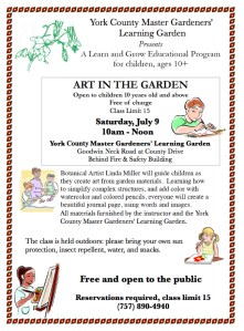 Art in the Garden – Saturday July 9, 2011; 10 AM to Noon. Children will study nature’s forms and learn how to create pages for their nature journal by combining drawings, written entries and paintings in watercolor and colored pencil. Materials will be provided. This free workshop for children will be held at Goodwin Neck Road at County Drive behind the fire and safety station. Limit: 15 children. Age: 10 & older. To register, contact the York County Master Gardeners’ Learning Garden at (757) 890-4940. Click on the image to download the flyer. To learn how the Art in the Garden program began and to view photos, click here.