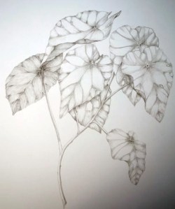 AML: So far, I have completed Hibiscus clayi twice — one H. clayi from the sunny Waimea Arboretum on the north shore and one H.clayi from the Lyon Arboretum in the rain forest. Hibiscus arnottianus, Gardenia brighamii, Pritchardia schattaueri, a deep-red ancient sugar cane, and a beautiful black taro plant. I am currently working on Abutilon eremitopetalum. So eight plants so far. I plan to complete another 10-12 paintings.