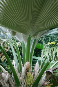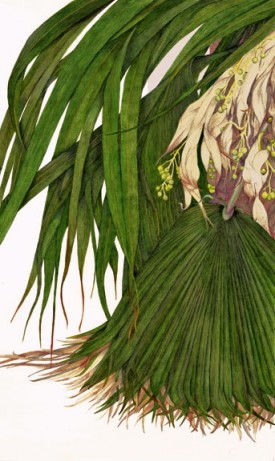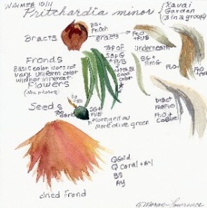 During my last trip to Hawaii in October 2011, I studied all of the Hawaiian Pritchardia palms in the Waimea Arboretum and the Lyon Arboretum. I spent days doing color test strips for the palms. In the beginning I used colored pencils but found that the colors were not easily translated into watercolors. So, I use a small light palette with all the necessary colors. I painted fronds, bracts, seeds, trunks and flowers and noted all the formulas I will use to recreate each part of the palm (e.g., Pth Bl+WYel+PRo, Pthalo Blue, Winsor Yellow, Permanent Rose).