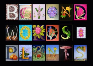 Studio 155 created the fun exhibition postcard at right by painting 10″ x 8″ letters in oil, watercolor or colored pencil and then mounting the letters on a panel. Learn more about the artists behind these letters on the Beyond Words website. The Small Works book is also available for viewing on this site, so be sure to visit and try your hand at matching idioms to their paintings!