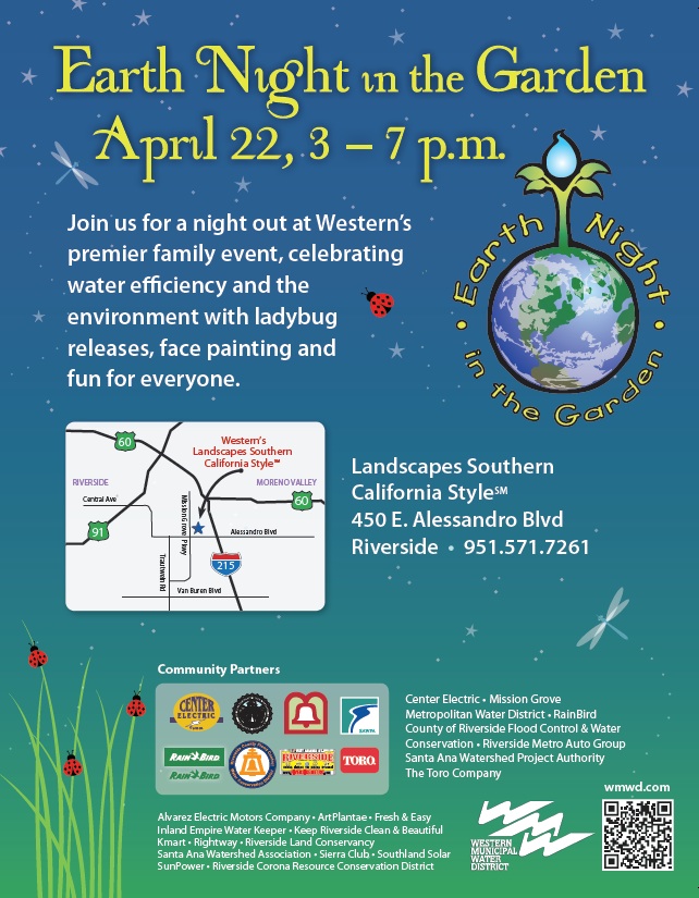 Earth Night in the Garden will be held at Landscapes Southern California Style, the water district’s demonstration garden located at the corner of Alessandro Blvd and Mission Grove Pkwy (click image to see map). This event begins at 3:00 PM.