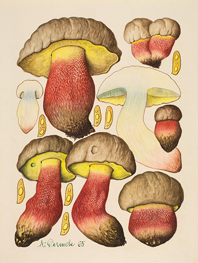 Boletus calopus Fr. [Boletus calopus Persoon, Boletaceae], watercolor on paper by Aurel Dermek (1925–1989), 1965, for Dermek and Albert Pilát, Poznávajme Huby (Bratislava, Veda, t. Tlač. SNP-Neografia, Martin, 1974, pl. 58), 30 x 21 cm, HI Art accession no. 6084.2.