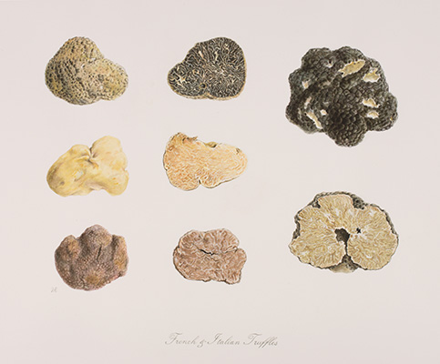 French and Italian Truffles [Tuber melanosporum Vittadini and Tuber magnatum pico Vittadini, Tuberaceae], watercolor on paper by Dorothee de Sampayo Garrido-Nijgh (1941–), 2009, 33.5 x 39 cm, HI Art accession no. 7782.