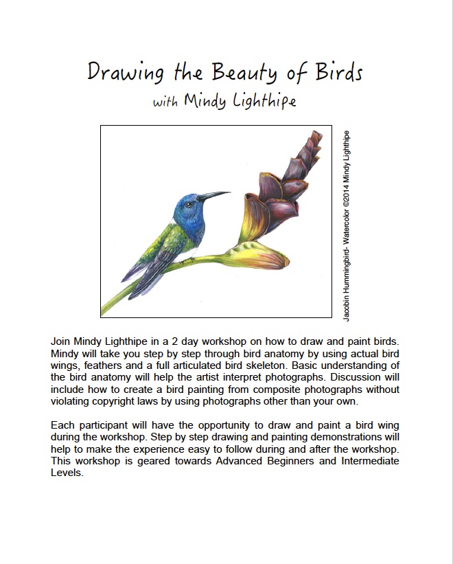 Mindy Lighthipe will teach a two-day class about how to draw and paint birds. Participants will learn bird anatomy by studying bird wings and an articulated bird skeleton. Participants will draw and paint a bird wing and learn how to work with reference photographs. Click on the image to learn more.
