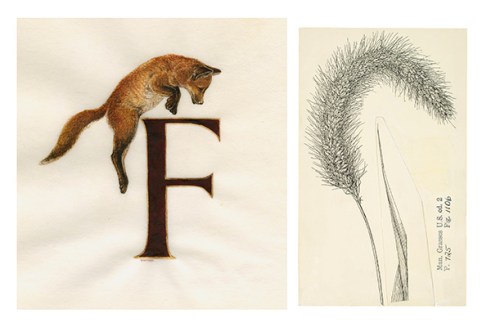 Left, F for the Fox, watercolor and shell gold on sheepskin parchment by Kandis Vermeer Phillips (1954–), ca.2010, 20 × 15 cm, HI Art accession no. 7891.08, reproduced by permission of the artist and right, Setaria faberi Herrm. [Setaria faberi R. A. W. Herrmann, Poaceae alt. Gramineae], ink on paper by an unknown artist for Albert S. Hitchcock (1865–1935), Manual of the Grasses of the United States, ed. 2, rev. by Agnes Chase (Washington, D.C., U.S. Government Printing Office, 1950, p. 725, fig. 1106), Hitchcock-Chase Collection of Grass Drawings, on indefinite loan from the Smithsonian Institution, HI Art accession no. 2496.0187.